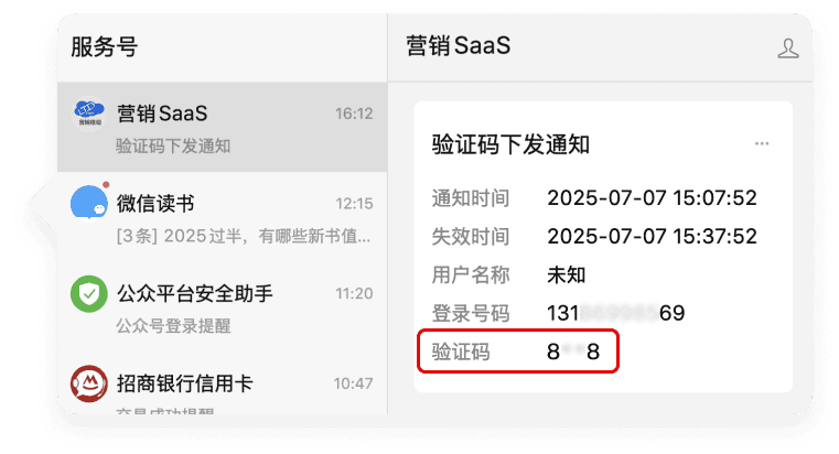 驗(yàn)證碼將通過(guò)“營(yíng)銷SaaS”公眾號(hào)下發(fā)